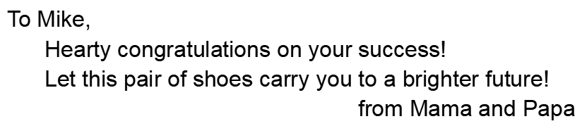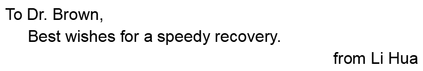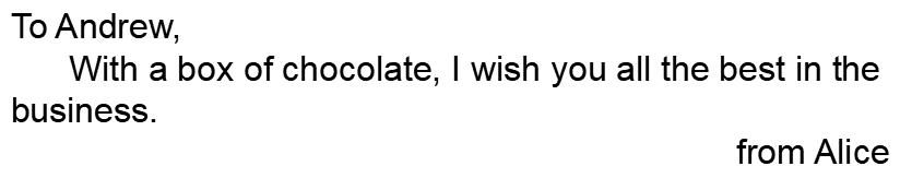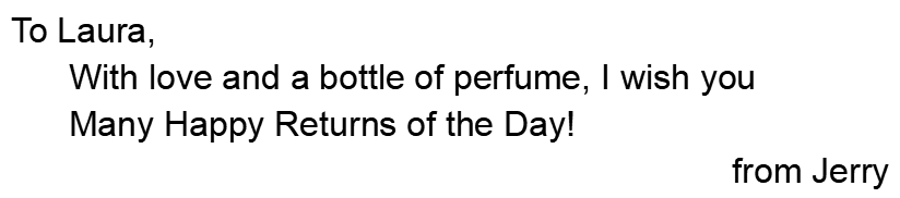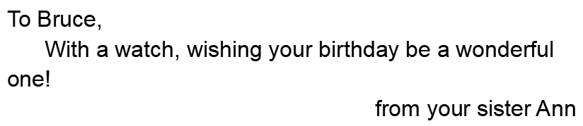 西方人在赠送礼物的时候,一般会在礼物上附带一张留言卡片。留言卡上的内容把你的祝福与礼品一起传递给对方,加深礼品的意义。下面是几张礼品卡,请注意留言的格式以及各自不同的情景.