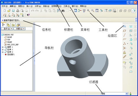 Pro/ENGINEER Wildfire 5.0工作界面主要由标题栏、菜单栏、导航栏、工具栏、绘图区、信息栏和过滤器等组成,如图1.1所示。