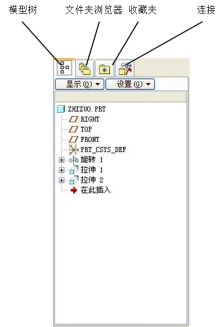 导航栏位于绘图区的左侧,在导航栏顶部依次排列着“模型树”、“文件夹浏览器”、“收藏夹”和“连接”四个选项卡。例如单击“模型树”选项卡可以切换到如图1.2所示面板。模型树以树状结构按创建的顺序显示当前活动模型所包含的特征或零件,可以利用模型树选择要编辑、排序或重定义的特征。单击导航栏右侧的符号“>”,显示导航栏,单击导航栏右侧的符号“<”,则隐藏导航栏。