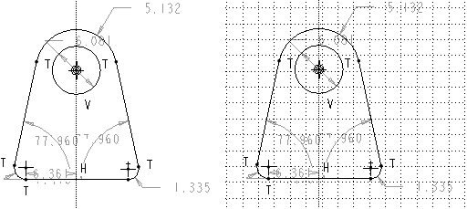 “草绘器”工具栏控制尺寸、几何约束1、屏幕栅格、线段端点的显示或隐藏。默认设置下,除了“屏幕栅格”功能关闭外,其余三个功能均为打开状态,系统显示几何约束符号和尺寸。如图2.7(a)所示。当打开“栅格”后,草绘区显示“栅格”,如图2.7(b)所示。