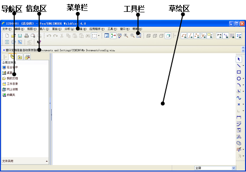 进入二维草绘的环境后,将显示如图2.2所示的工作界面。该界面是典型的Windows应用程序窗口,主要包括:标题条、导航区、菜单栏、工具栏、草绘区、信息区等。