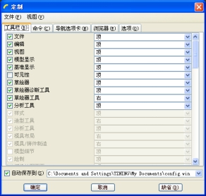 工具栏可位于窗口的顶部、右侧和左侧,采用拖动的方式可以改变工具栏的位置。在任一工具栏上右击,弹出如图2.3所示的快捷菜单,选择需要显示或隐藏的某一工具栏,控制其显示与否。当选择“工具栏”选项时,将打开“定制”对话框的“工具栏”选项卡,在其中也可以设置工具栏的显示与位置,如图2.4所示。在绘制二维草图时,应显示“草绘器”和“草绘器工具”工具栏。