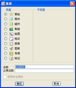 由“草绘”模块直接进入草绘环境。创建新文件时,在如图2.1所示的“新建”对话框中的“类型”选项组内选择“草绘”,并在“名称”编辑框中输入文件名称后,可直接进入草绘环境。在此环境下直接绘制二维草图,并以扩展名为.sec保存文件。此类文件可以导入到零件模块的草绘环境中,作为实体造型的二维截面;也可导入到工程图模块,作为二维平面图元。