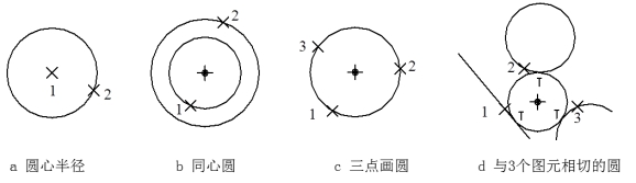 Pro/E创建圆的方法有:指定圆心和半径画圆、画同心圆、三点画圆、画与3个图元相切的圆,如图2.11所示。