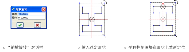 (4)单击确定放置形状的位置,系统弹出如图2。38(a)所示的“缩放旋转”对话框,同时被输入的形状位于带有句柄(控制滑块)的虚线方框内,“平移”控制滑块与选定的位置重合,如图2.38(b)所示;