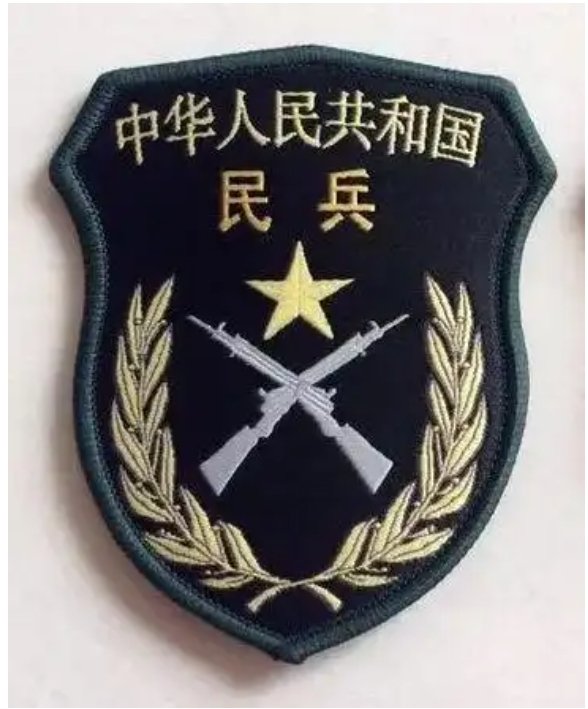 如上图所示,民兵的臂章同样是盾牌型的外形、文字和橄榄枝,图案是五角星徽和两支交叉步枪。
