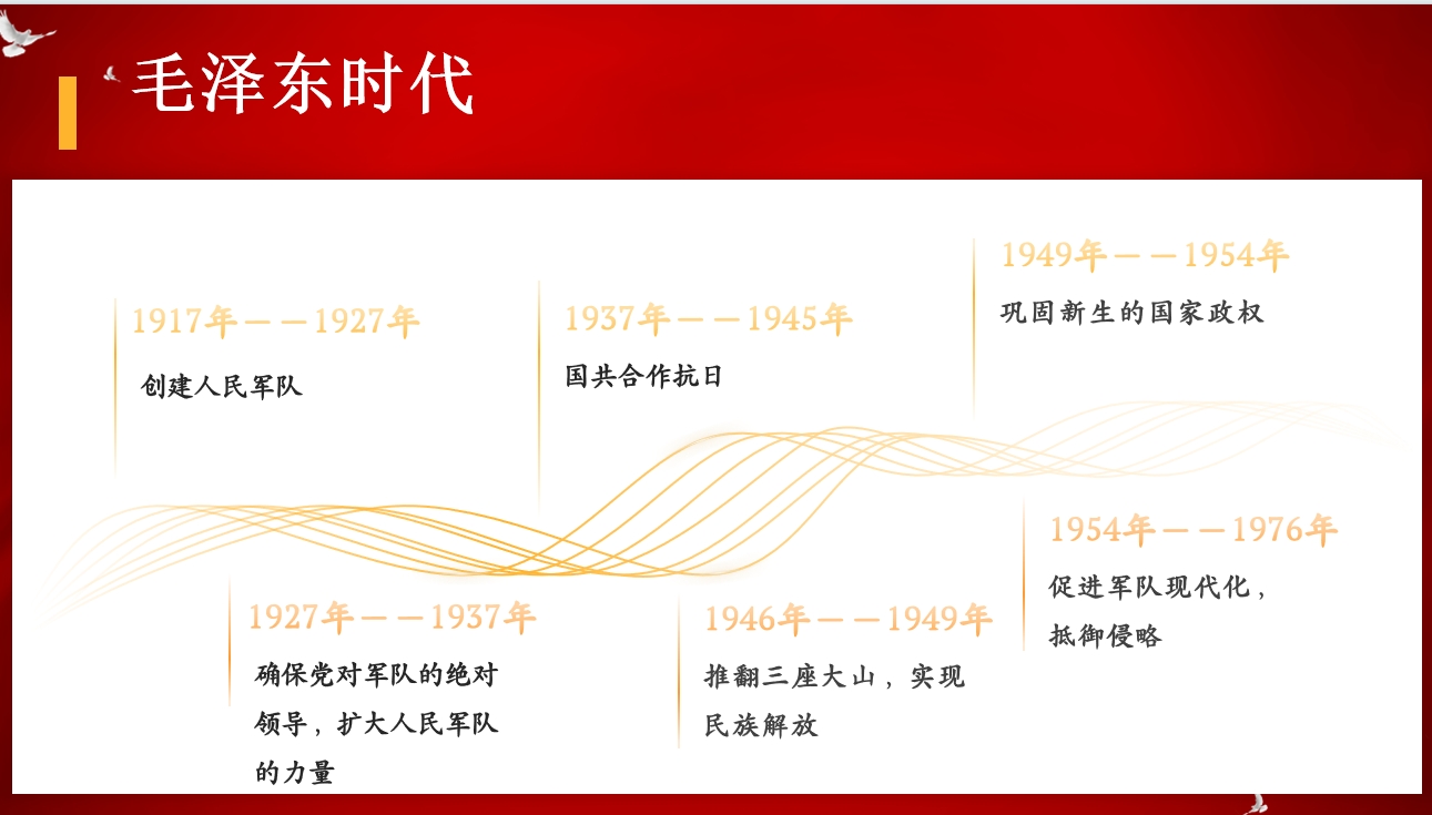 综上所述,人民军队在毛泽东时代的不同时期有着不同的目标任务,即土地革命时期,使红军绝对服从于党的领导;抗日战争时期,把日本侵略者赶出中国;解放战争时期,推翻三座大山,实现中华民族的完全解放;建国初期,巩固新生的国家政权;1953年—1978年,促进军队现代化,抵御侵略。