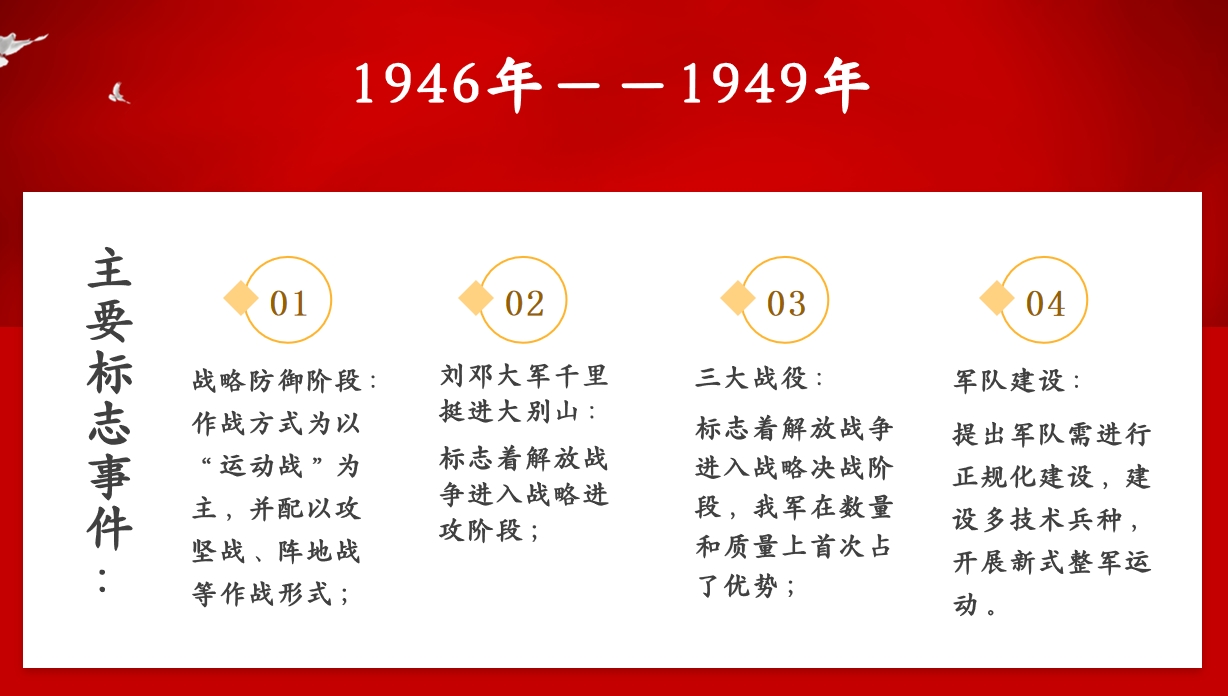 1946年,解放战争爆发,在战略防御阶段,我党率领解放军采取的作战方式为以“运动战”为主,并配以攻坚战、阵地战等作战形式(运动战指通过不断的机动来寻找战机,在敌人之间穿插迂回,让敌人无法判断自己的动机,集中优势兵力,分散敌人兵力,一股一股的消灭敌人,最后取胜,用一句话来概括就是“避敌主力,诱敌深入,集中优势兵力与各个击破”,适合敌强我弱的情况下使用。而游击战是化整为零,以小股部队的方式,不断的骚扰敌人,特别注重对敌人重要目标和后勤部队的袭击,打完就跑,让敌人防不胜防,但又找不到人。这是非常弱小的一方对强大的敌人所做的最佳战法。比如,土地革命时期,工农红军基于自身兵力的弱小,作战方式以游击战为主;抗日战争时期,八路军、新四军执行“基本是游击战,但不放松有利条件下的运动战”的方针,仍然是以游击战为主,但同时也进行了像百团大战这样的运动战;在解放战争中,中国人民解放军按照以歼灭敌人有生力量为主要目标、不以夺取地方为主要目标的战略方针,进行了大规模的运动战,最后取得了解放战争的彻底胜利);