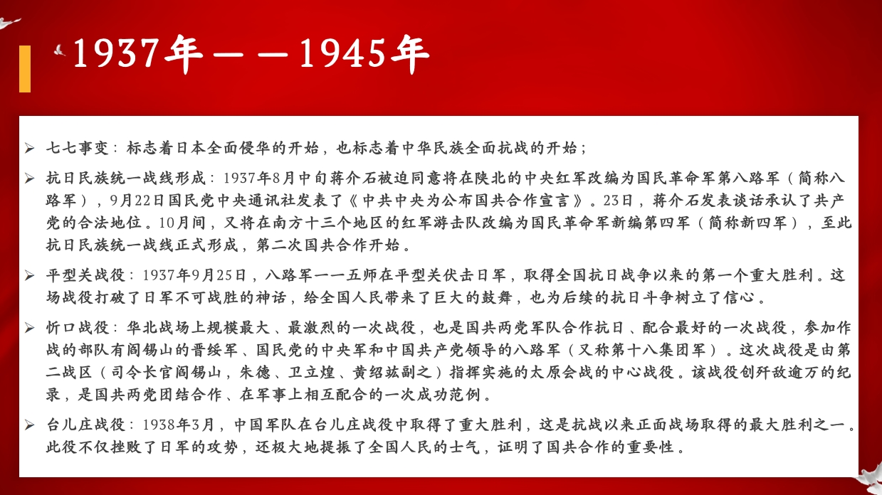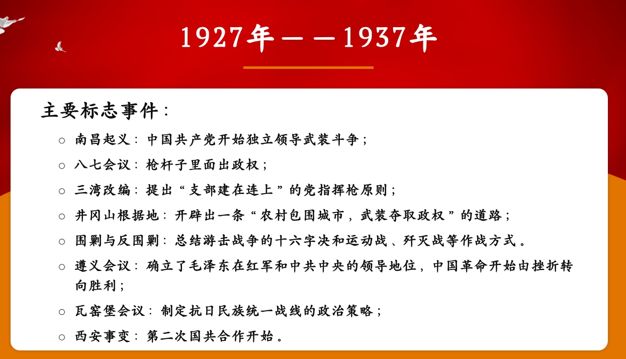 在王明左倾错误思想的指导下,第五次“反围剿”遭受重大失败,中国共产党人被迫率领工农红军进行战略转移,开始了二万五千里长征,在越过国民党设置的四道封锁线之后,1935年1月,中央红军到达遵义,“遵义会议”成功召开。这次会议确立了毛泽东在红军和中共中央的领导地位,中国革命开始由挫折转向胜利;1935年12月,瓦窑堡会议召开,会议提出制定抗日民族统一战线的政治策略,共产党提出“国共两党停止内战,一致对外”;1936年1月,红一方面军、红二方面军和红四方面军在甘肃会宁胜利会师,标志着万里长征结束。蒋介石想借此时机将仅剩的红军势力彻底消灭于西北地区,下令张学良、杨虎城负责此次军事行动,自己也飞往西安督战,但是12月12日“西安事变”爆发,蒋介石被迫放弃“攘外必先安内”的策略,接受了共产党提出的“建立抗日民族统一战线”的主张;1937年“七七事变”爆发,毛泽东在对中日两国国情理性分析的基础上,批判了“亡国论”和“速胜论”,提出“持久战论”;1945年,抗战胜利前夕,中共七大召开,阐述了人民军队、人民战争和人民战争的战略战术,指出我军唯一的宗旨是全心全意为人民服务。