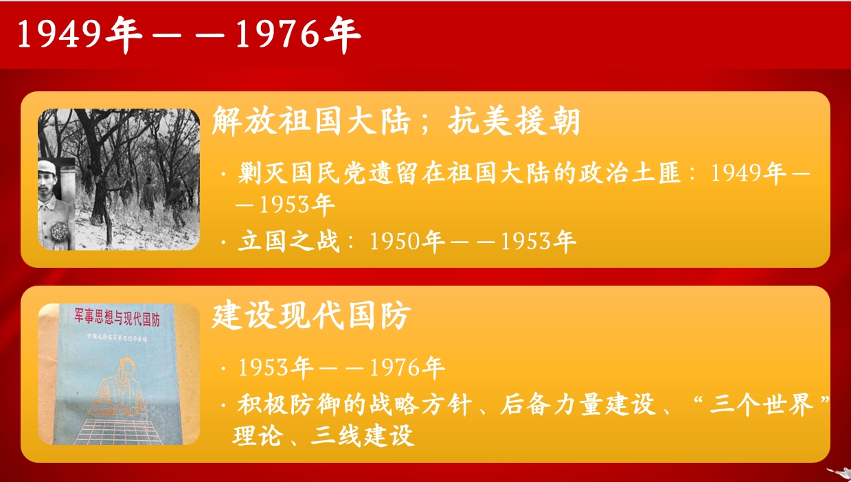 1950年,美国公然率领联合国军发动朝鲜战争,一度将战火引到鸭绿江,以毛泽东为代表的党中央毅然作出“抗美援朝、保家卫国”的正确决策,打得一拳开,免得百拳来。在抗美援朝中,中国人民志愿军采用“零敲牛皮糖”的作战原则(毛泽东“伤其十指不如断其一指”的军事思想在作战中的运用,即集中我方优势兵力打小的歼灭战)、夺取先机之利、加强后勤保障等,最终取得了战争的胜利。