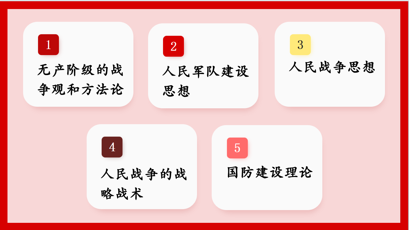 毛泽东军事思想是一个完整的科学体系,包括无产阶级的战争观和方法论、人民军队建设思想、人民战争思想、人民战争的战略战术和国防建设理论五部分。