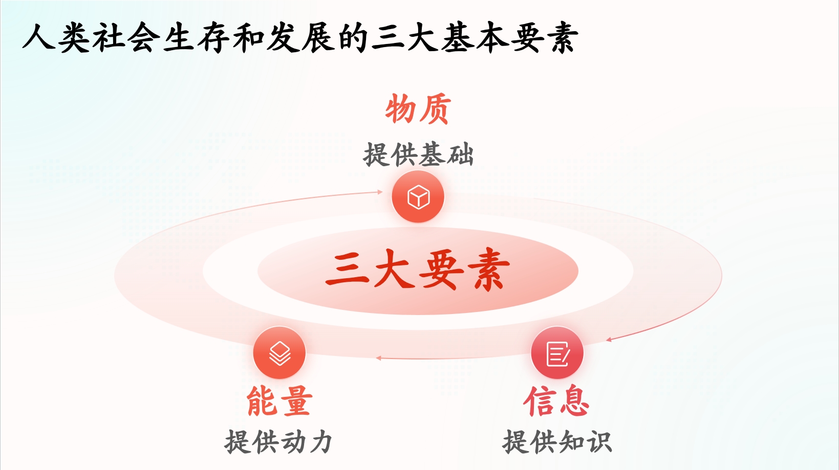 人类社会生存和发展的三大基本要素包括物质、能量和信息。其中,物质为人类社会的生存和发展提供基本的物质基础,能量提供基本动力,信息提供知识。