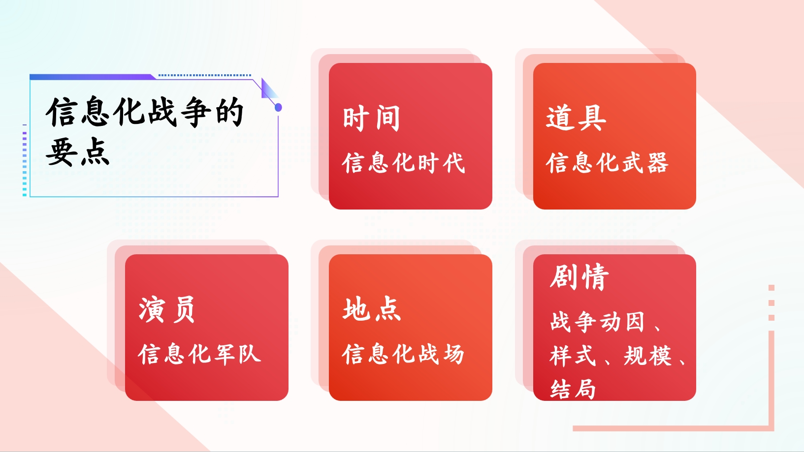如果把一场信息化战争比作是一部电影的话,那么所谓的信息化战争指发生在信息化时代,在信息化战场上,由一支信息化军队使用信息化武器而进行的一场战争。其关键要素如下图所示: