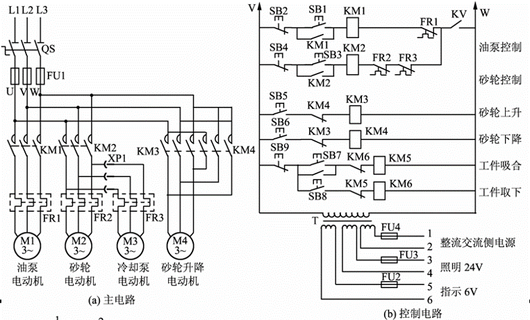 1)砂轮、液压泵、冷却泵三台电动机都只要求单方向旋转;