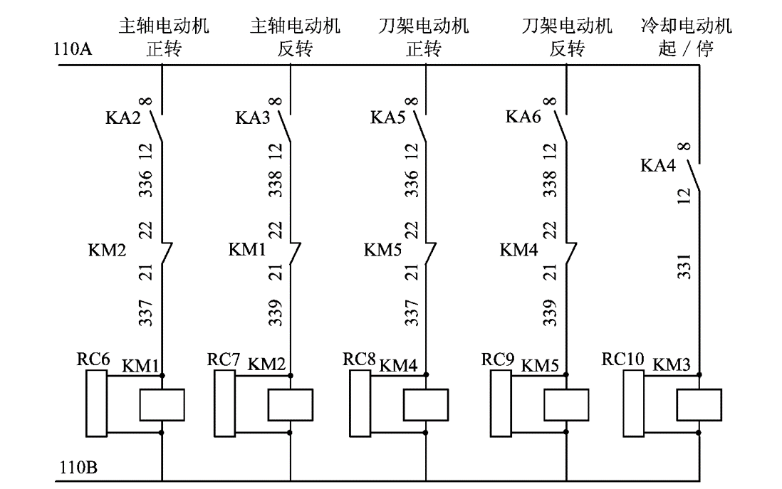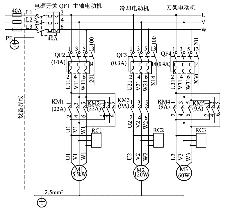 n图2为机床的动力线路,图中交流接触器KM1和KM2用来控制主轴电动机M1的正反转,断路器QF2作为主轴电动机的过载及短路保护;交流接触器KM4和KM5用来控制刀架电动机M3的正反转,断路器QF4作为刀架电动机的过载及短路保护;交流接触器KM3用来控制冷却电动机M2的起动和停止,断路器QF3作为冷却电动机的过载及短路保护。灭弧器RC1~RC3用来保护交流接触器的主触点,防止当主触点断开时,在动、静触点间产生强烈电弧,烧坏主触点。断路器QF1用来对整个动力线路进行过载及短路保护