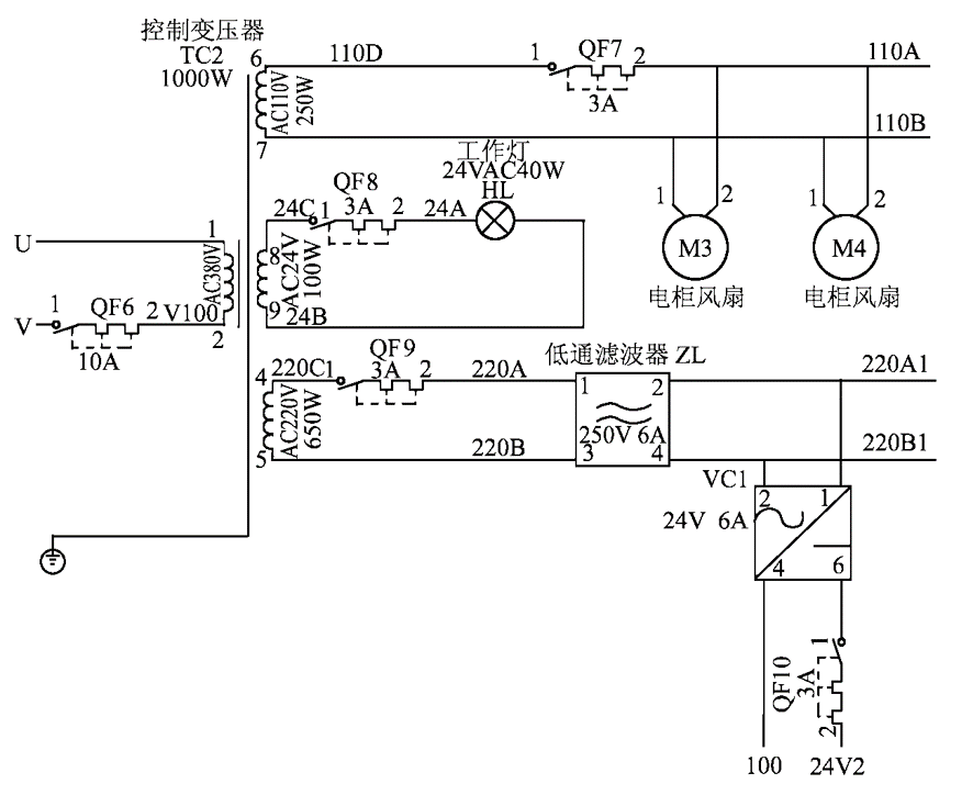 n图1为机床的电源线路,图中变压器TC2原边接三相AC380V,副边三组绕组分别提供AC220V、AC24V、AC110V电压,AC220V给开关电源供电,AC24V给工作灯供电,AC110V给电柜风扇供电,断路器QF6~QF10用来对线路进行过载及短路保护。