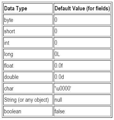 The following chart summarizes the default values for the above data types.