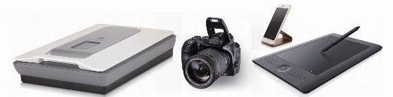 在进行数字插画创作之前,我们一定要先认识和准备好软硬件,基本的电脑设备就不在这里多说了,请参考市场行情。除此之外绘图必备的也是最为重要的硬件就是模拟画笔的“数位绘图板”,它包含一块感应面板的数位绘图板,以及一只模拟画笔的数位绘图笔。它们内藏感应芯片,可以接收我们传达的信息,数位绘图板忠实地记录着绘图的轨迹,而数位绘图笔则记忆我们下笔施加的力道。换言之,数位绘图板是通过仿制我们熟悉的物品来稳定地获得所需的数据并将数据提供给电脑。既然是模仿画板与笔杆样貌,在一些细节上总会有一些差异,早期的数位绘图笔的造型参考的是一般笔杆,加上芯片技术的局限,笔身过于倾斜就容易感应不到或是感应异常。后来随着芯片制作技术不断翻新提高,加上大幅改良以接近绘图用的画笔,逐渐摸索出专门为数字插画量身定做的笔款设计,使数位绘图板比鼠标更适合手的操作,并且将应用扩展到更多元的范围。笔者用的数位板是Wacom的影拓5代。预算多的朋友,也可以考虑一些数位屏或数位平板。其他的硬件设备还有数码相机、扫描仪等,但是随着时代的发展,手机等新兴设备正在成为许多硬件的代替品。(图2-1)
