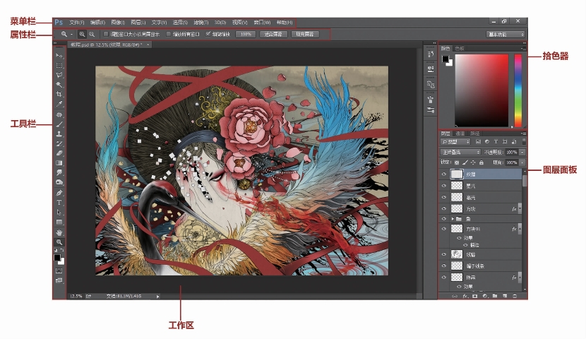 目前广为人知的美术绘图专用软件是 Photoshop 和 Painter,矢量绘图软件则有Illustrator和CorelDRAW,若是加上可用作绘图的网页动画制作软件 Flash,以及小有知名度的 ArtRage、openCanvas、SAI、ComicStudio等绘图软件,单是美术绘图软件的名称就能让人看得眼花缭乱。数字插画的绘图软件和传统绘画的画材一样,没有绝对的优劣之分,大家可以多尝试摸索各软件间的差异,找出适合自己的插画软件,取长补短,混合使用。本书所有范画均在 Photoshop cc2015里完成。接下来我们来对Photoshop做个初步了解。(图2-2)