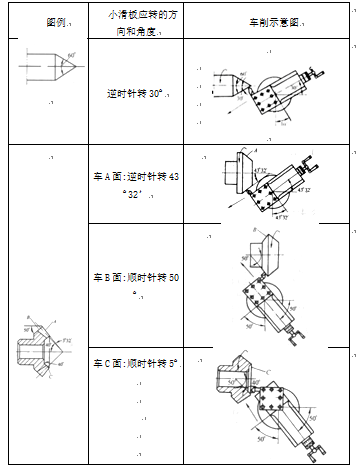 车外圆锥和内圆锥工件时,如果最大圆锥直径靠近主轴,最小圆锥直径靠近尾座,小滑板应沿逆时针方向转动一个圆锥半角α/2;反之,则应顺时针方向转动一个圆锥半角α/2;见表3.2。