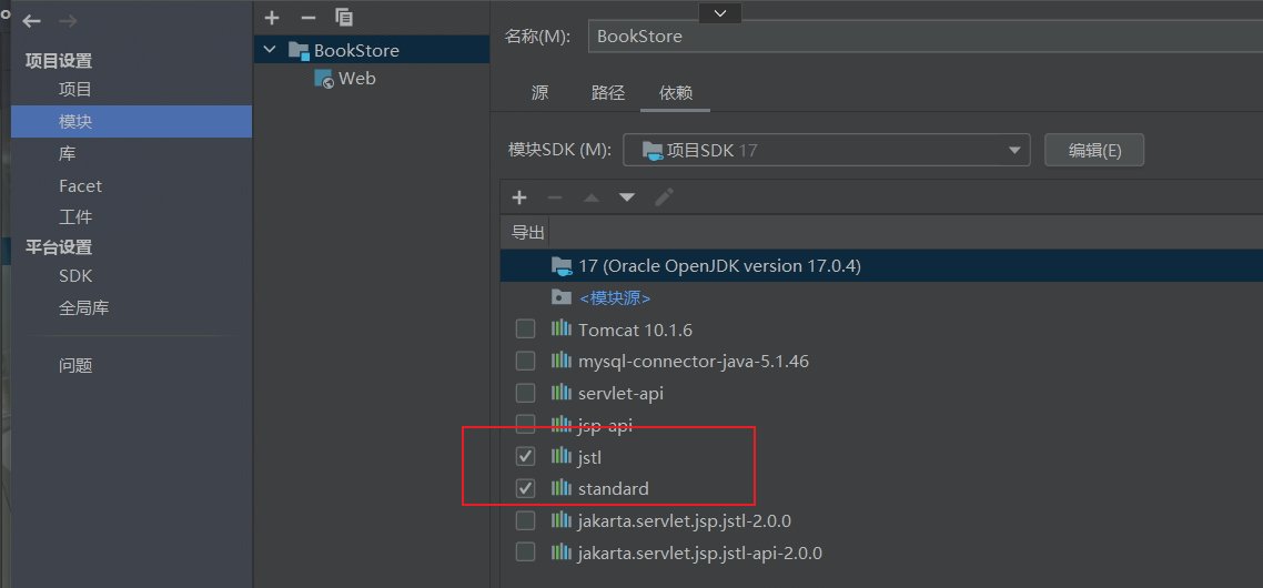 在本地找到下载的jstl.jar和 standard.jar文件,确定,并勾选应用。