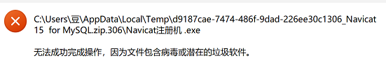 问题描述:navicat注册机打不开,提示无法成功完成操作,因为文件包含病毒或潜在的垃圾软件。