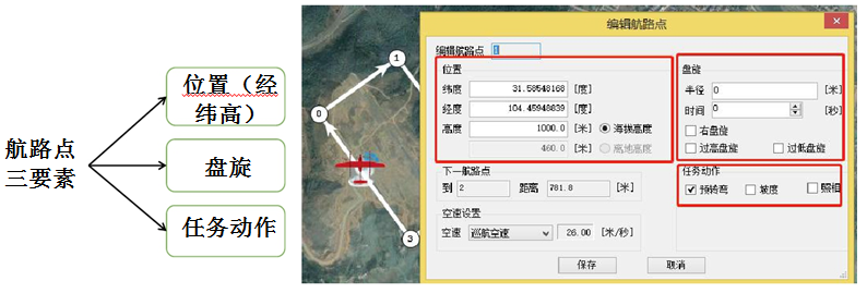 位置(经纬高):以经度、纬度、高程(海拔/相对)确定无人机飞行目标点的空间位置。
