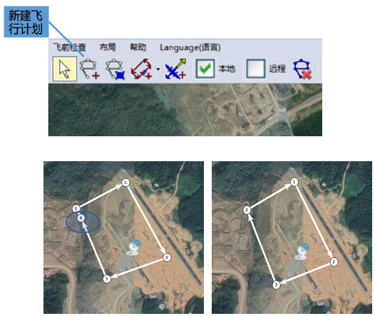鼠标左键在地图中键入航路点,并在结束规划时靠近将要与其闭合的航路点进行双击。最终会在双击点位置生成一个航路点,且与下一个航路点闭合。