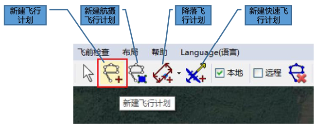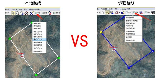 远程航线:通过“发送飞行计划”将本地航线发送至自驾仪保存,且无法对航路点或飞行计划进行编辑,以蓝色表示。
