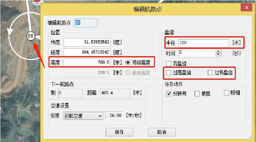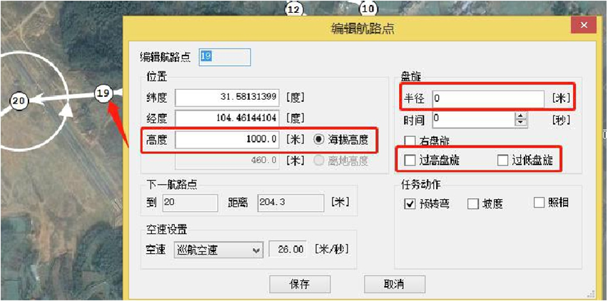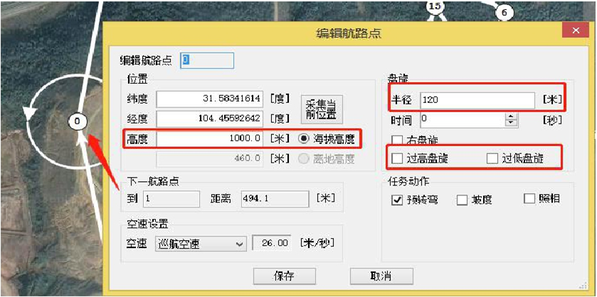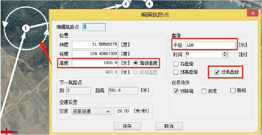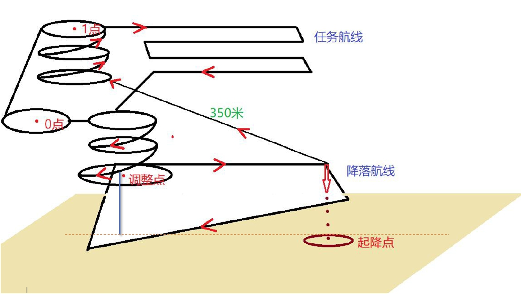 1号航路点:位于起飞方向,且盘旋路径距起飞点至少350米远,高度与任务航线一致,过低盘旋;