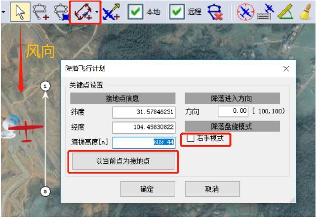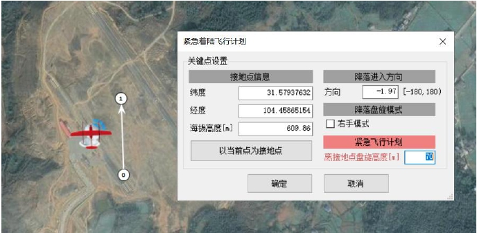 ②地图上两点确定进场方向,默认以“0”号点为接地点,离接地点盘旋高度为70米,盘旋高度可根据现场环境情况进行调整。