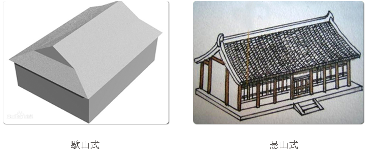 屋面多为“硬山式”,只是在建简易房屋、矮小房屋、单层房屋有时采用“悬山式”,部分大型建筑如祠堂门厅等采用“歇山式”。