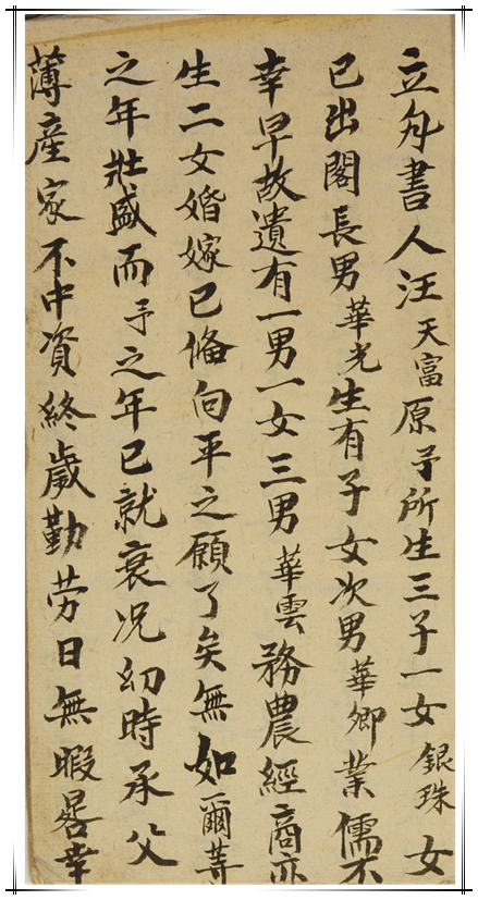 民国十六年婺源汪天富所立的一件分家阄书,主要内容为:其有三子一女,女已出嫁,早年艰苦创业,天从人愿,虽不能称康富,但也可免受饥寒。现因年已七旬,室人亡故,家事难以撑持。将所置产业除去生作口食,死后作祀产的田业外,三股均分。从中了解当家庭解体时,如何进行财产分割,以及老人赡养问题。