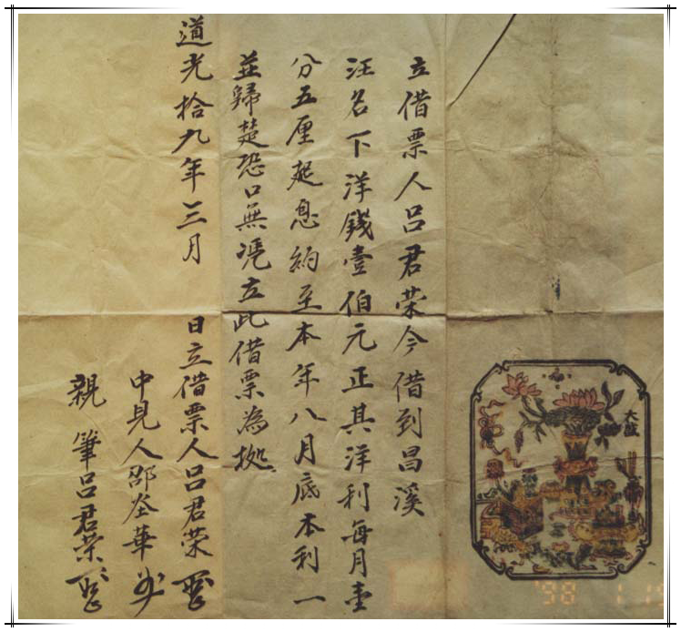 道光年间歙县的一张借票,内容告诉我们,立契人借洋钱一百元,每月一分五厘起息,承诺本年八月本利一并归还。从中可知当时的利率,大量的类似文书,对这一阶段的经济史研究具有重要的参考价值。另外,该借票制作精美,有花草图案,反映了当时徽州饾版雕刻印刷技术,对徽州版画研究也具重要参考价值。