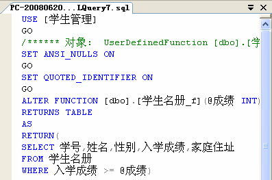 (2)对出现在查询编辑器窗口中“学生名册_f”函数的T-SQL语句进行修改即可,如图所示。