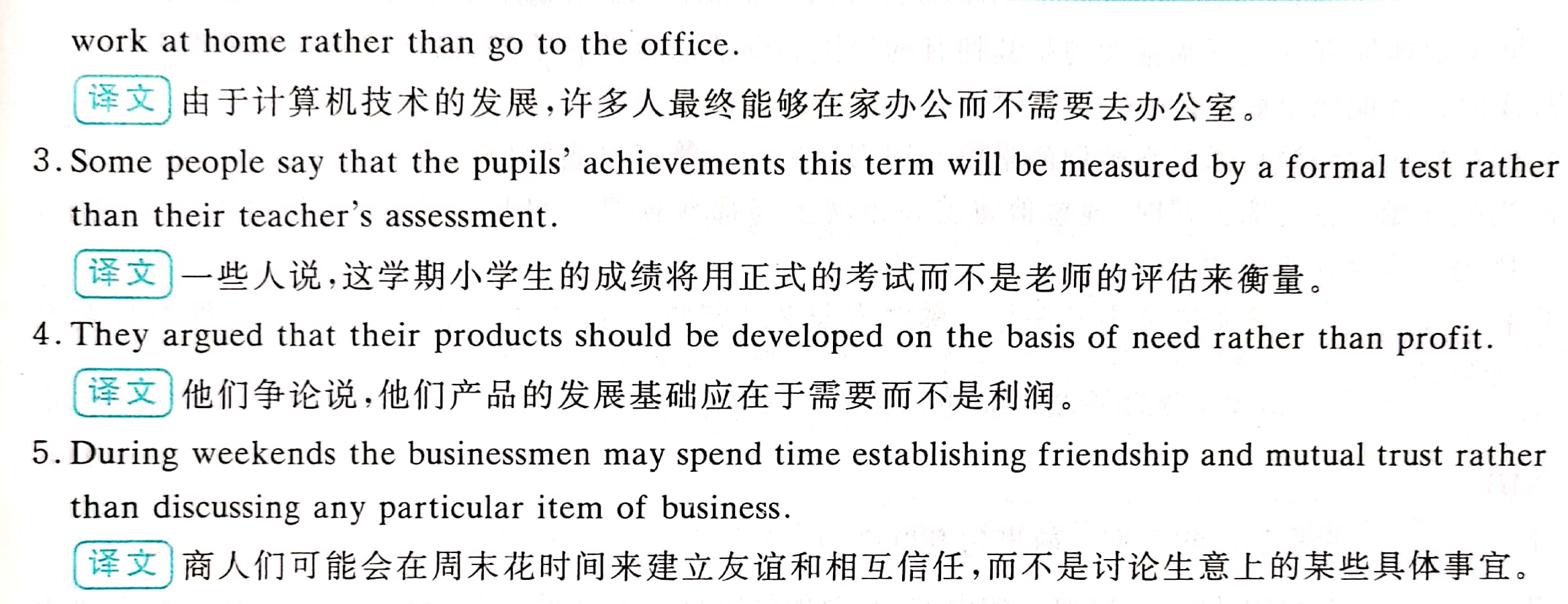 点拨:“rather than”可作连词链接两个并列成分,表示在两者中进行选择,意为“是A而不是B”、“选A不选B”、“宁愿A而不是B”等。它连接的两个并列成分可以是名词、代词、形容词、介词 (短语)、动名词、分句、不定式、动词等。