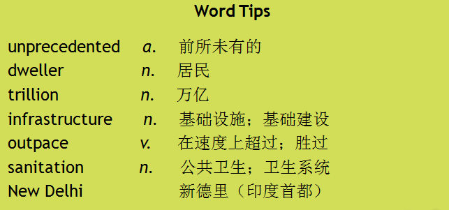 Nowadays, our cities in the world grow at an (1)_______ rate. By 2050, the percentage of city (2)_______ will be far more than that of the beginning of human history. To keep up the growth, every year cities (3)________ a large sum of money into public service. In many places, urban growth tends to (4)________ even the best efforts to ensure people’s basic needs. At the same time, our cities meet great challenges as well as provide many opportunities. A key issue of the future is to build (5)________ cities. Let’s begin from now on.