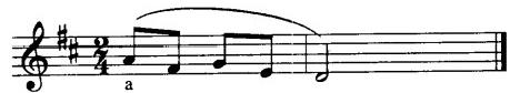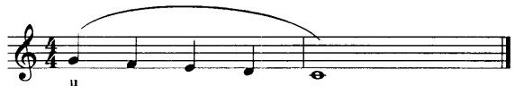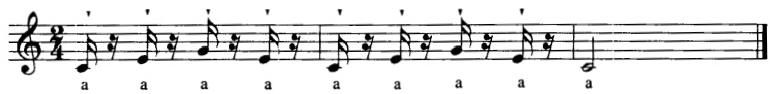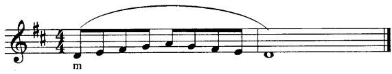 对我来说,最难的元音是"啊"。这时候喉咙最开放,气流最难控制得适当。所以我养成一个习惯,用连续的"呜、哦、啊、哎(ei)、衣"来开始我的练习。我从来不用延长的音开始,因为它会使我的喉咙来得及僵硬(意思是:唱短促的音时,发音后,喉咙还来不及僵硬就又开始发另一个音了;而唱延长的音时,由于需要继续唱下去,喉咙容易僵硬起来,所以开始练习时不用延长的音。)。我使用快的、柔和的音阶练习,始终记住我提到过的气息控制的基本原则,并且始终保持仿佛在吸气的感觉。这是表明我的意思的一个例子。为了避免高音的尖声,我用"呜"来唱最高的音,并且用"呜"来唱下降的音。