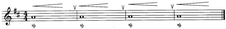 此练习,可以由低向高再由高向低做长音 “a”“e”母音的上、下滑动。经常坚持叹气发声练习,能使声音很快流动起来。它对于解决声门挤卡、发音困难的问题,有着特殊的功效。叹气发声的方法,是歌唱的重要技巧之一。