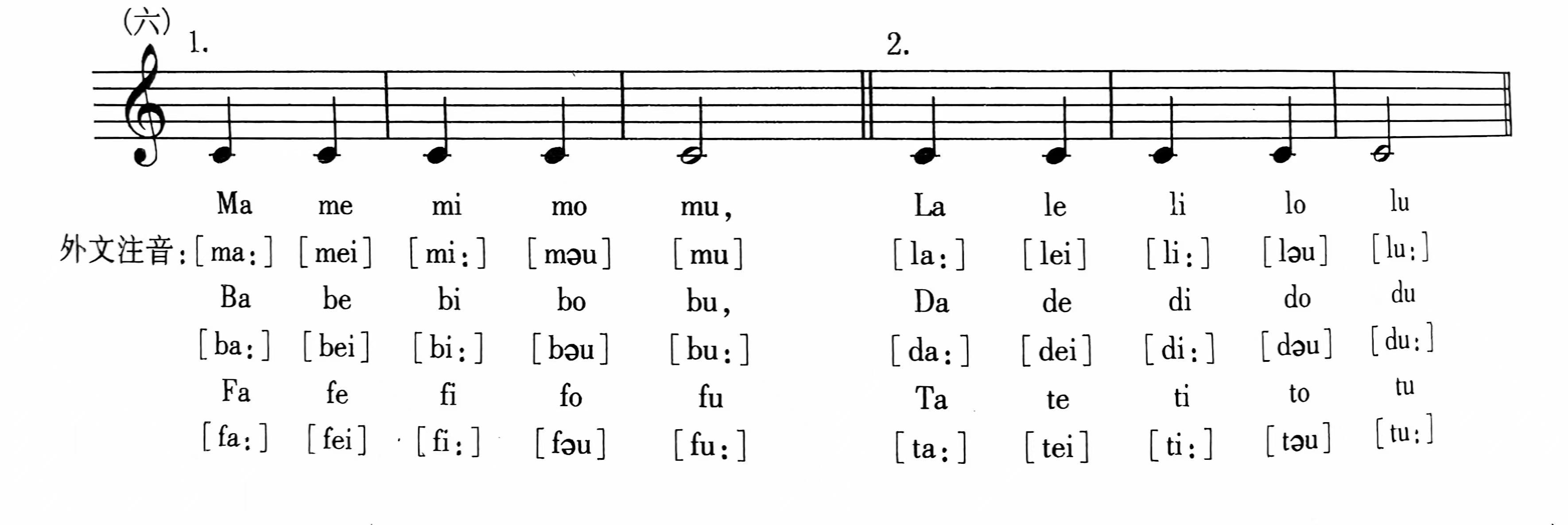 下面列举一些子母音结合的练习。做这一类的练习时应该注意的是:凡不需要舌肌去做的子音,一律伸着舌肌做;凡必须舌肌去做的子音,则在做完子音以后让它马上回到伸着(象喘气那样)的样子去。最简单的是不换音高的练习,如: