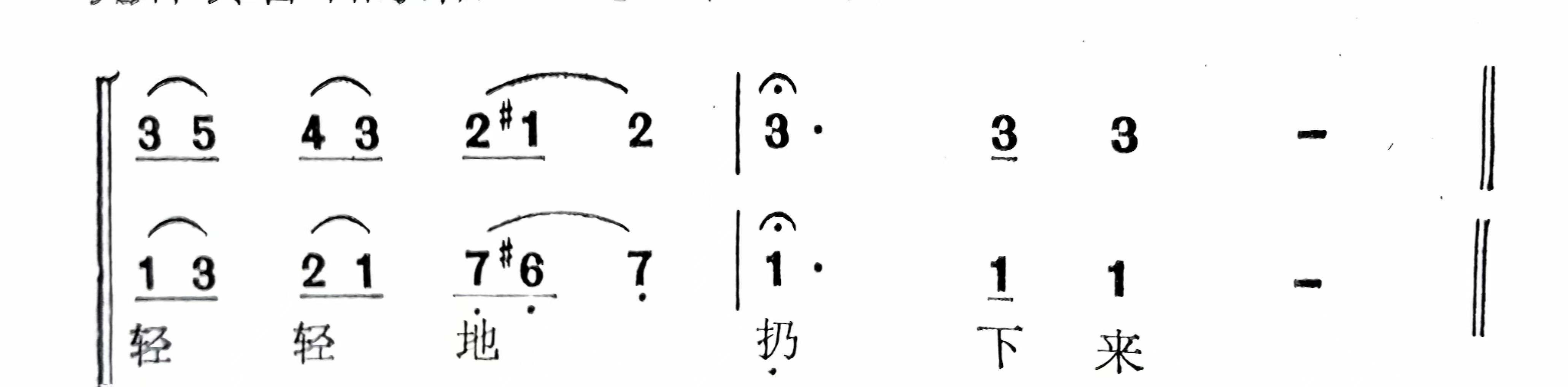 如青海民歌《半个月亮爬上来》的无伴奏合唱的结尾一句“轻轻地扔下来”的“扔”字,就突出地采用了提前归韵、延长字尾的手法。这个“扔”字的提前归韵,即表现出女方俏皮、诙谐、含羞的心情,又表现出男方急切地想得到爱情信物——玫瑰花的迫切、热烈的心情。