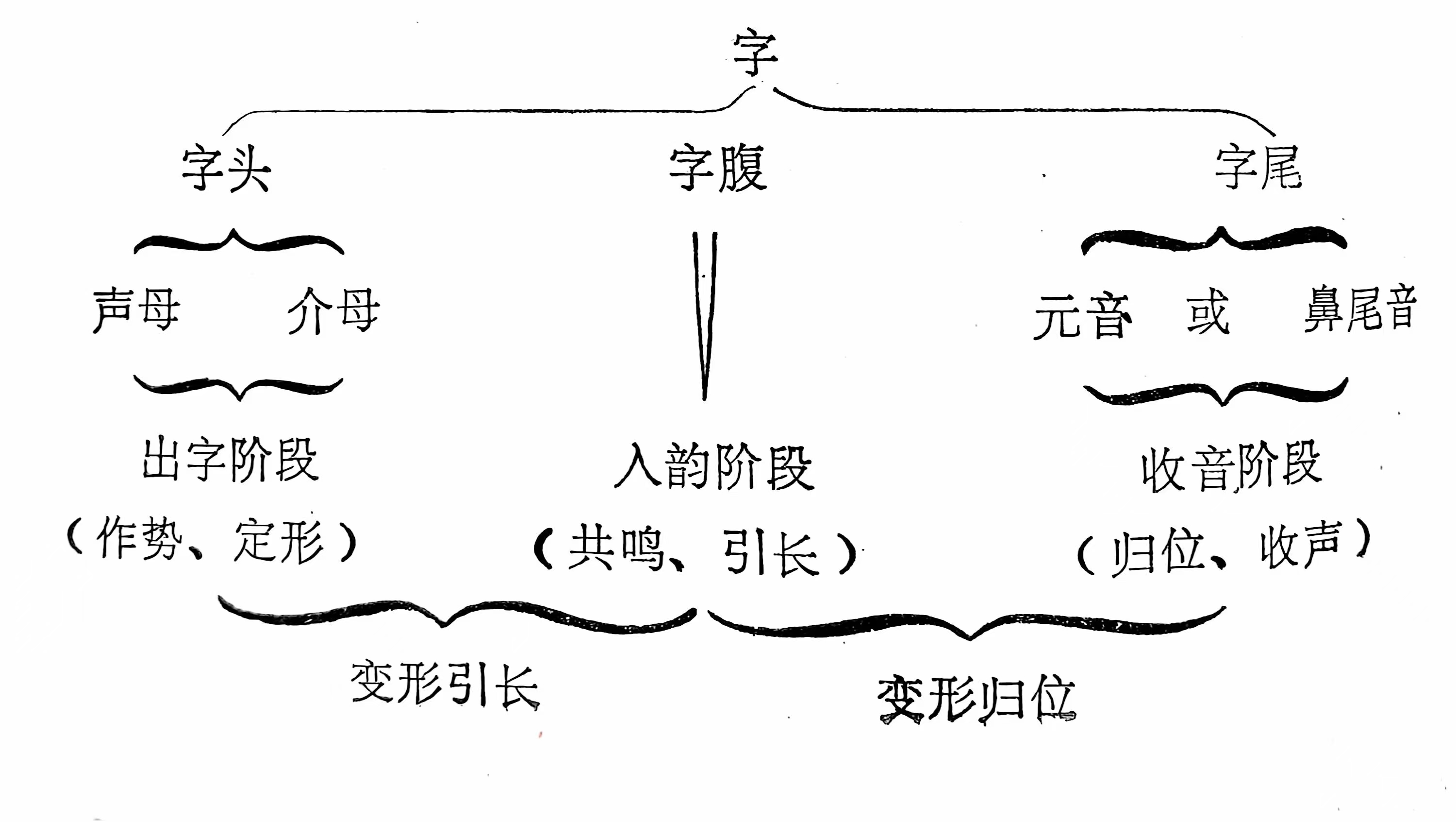 应尚能先生在所著的《依字行腔》中认为:“从歌唱的角度来划分,字的发音可以由一个至四个部分构成:字头、介母、字腹、字尾或归韵。字头与字尾都是子音,其他都是母音。因此,在我们的文字里,子音有两种形式出现:字头与字尾;而母音有三种形式出现:介母、字腹和归韵。在我国推行的普通话里,字尾只有两个:一个是n (如安),另一个是ng (如清)。”