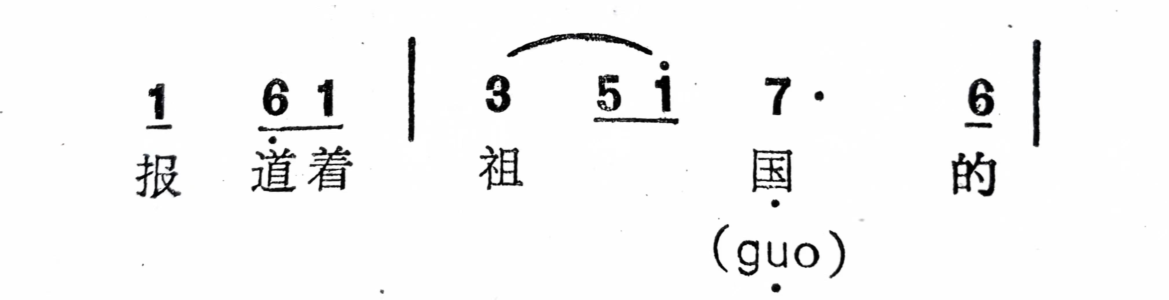 如在《北京颂歌》中“报道着祖国”的“国”字,就采用延长介母音的手法。“国”(guó) 字字头中的声母“g”是闭塞成阻的辅音——不能延长,只能延长介母音“u”(乌)。这一手法的运用,使人感到幅员辽阔的祖国正以一日千里的速度蓬勃发展,同时也生动地表现出演唱者无限热爱祖国的自豪心情。