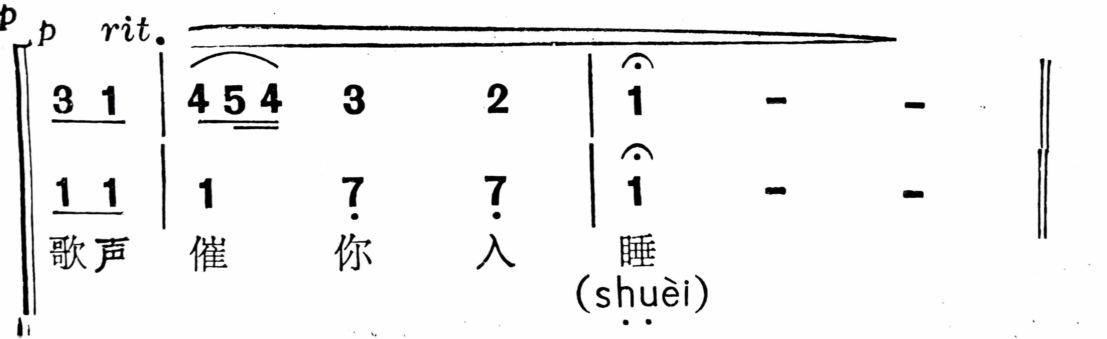 翻译的合唱歌曲《摇篮曲》(布拉姆兹曲)的最后一句“歌声催你入睡”的“睡”字就采用这一手法。将“睡”(shui)字声母“sh”(诗)的发音夸大并先漏气出声,再渐转到介母音“u”(乌)的发音,然后再轻滑圆湛地转到韵母 ei的发音,直至发音结束突出了小宝宝已经睡着的特殊意境,给入一种安逸舒适、睡意矇胧的感觉。