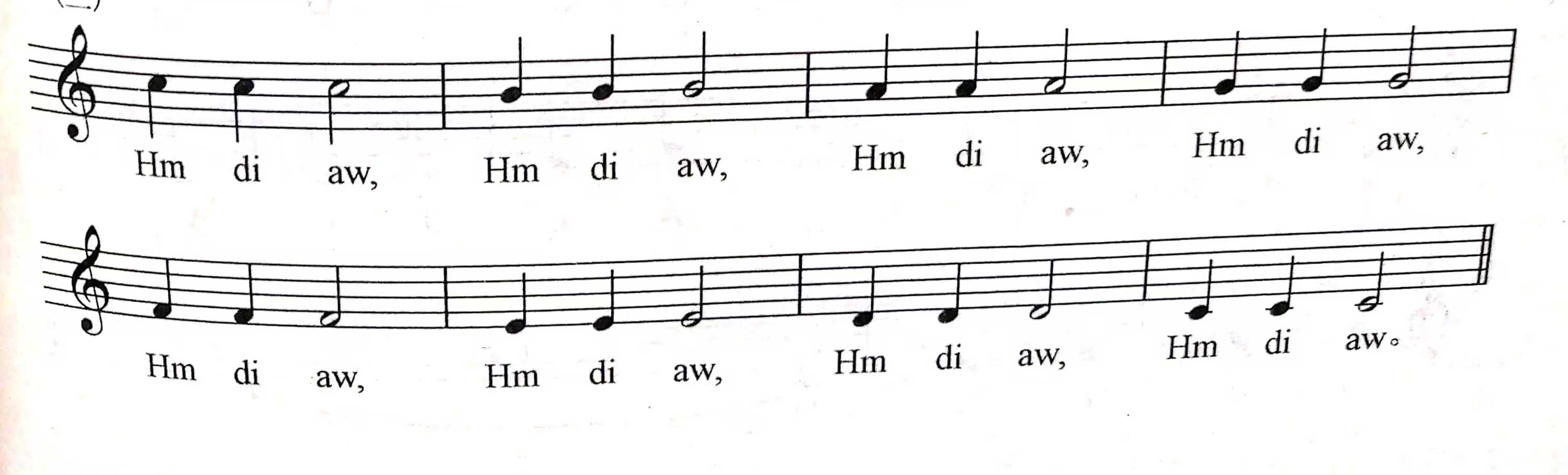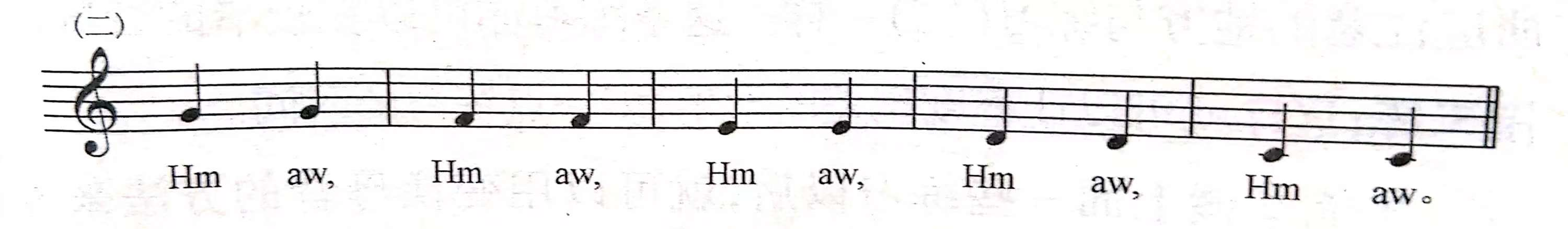 这条练习与上面第一条仅有一字之差,就是在Hm 和aw 中间插进了一个di,但就这一字之别,把工作复杂化了。di 不仅有子音,并且要求舌尖来做它。这就要求做完d以后,把舌肌伸出来做母音i。因为在 aw 的前面是一个i 字母音,所以这个练习听起来好像Hm、 di 、yaw。这条练习亦可以在较窄的音域范围来练;这样就可以让程度稍差的学生,多一点练习的时间。
