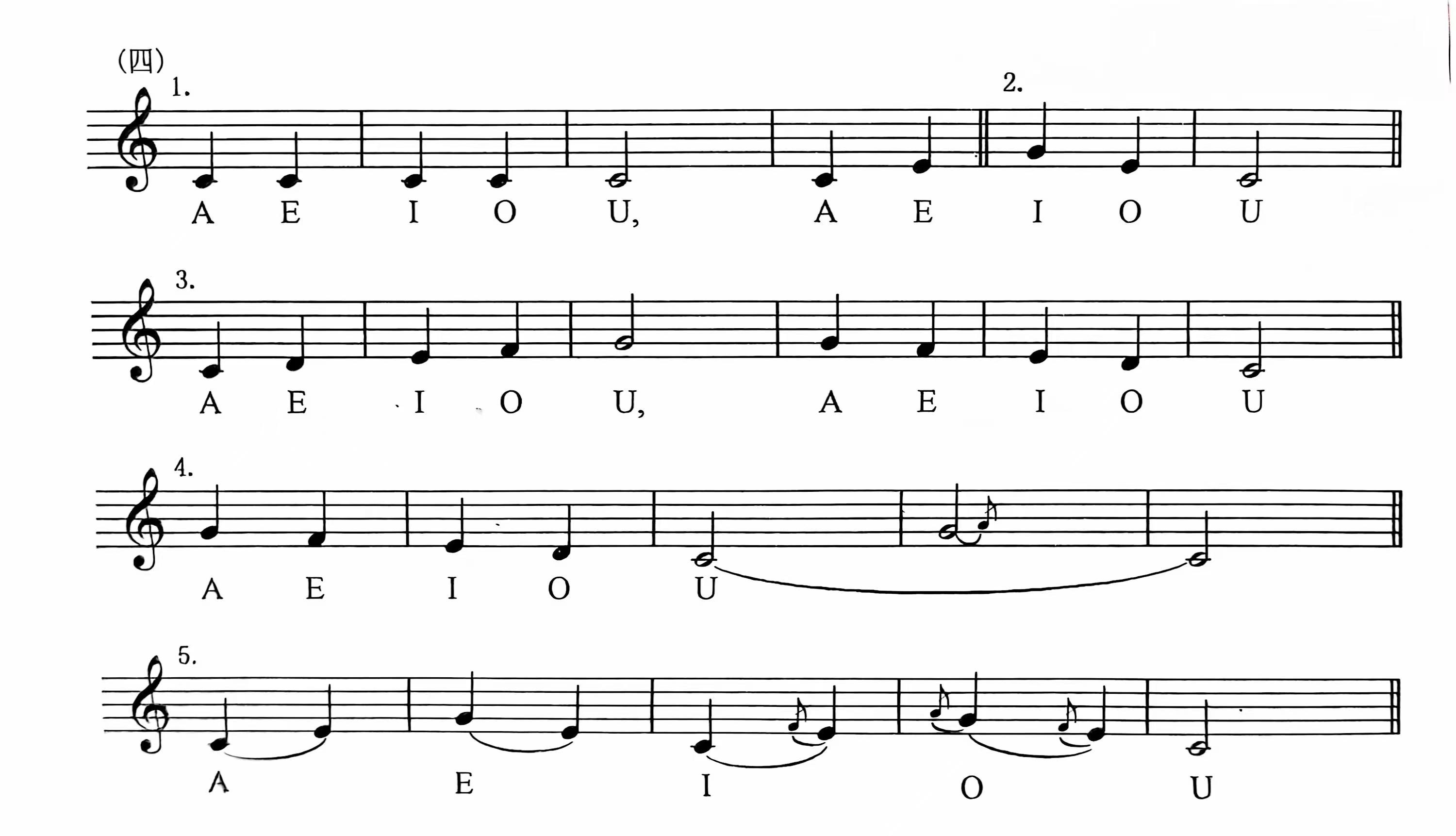 这一类的练习可以根据需要,发展或变化到更复杂的形式,其目的无非是要很好地掌握音高和母音同时变化的结合。接下去就可以练一些母音不太变动而音高却变动较多的练习。
