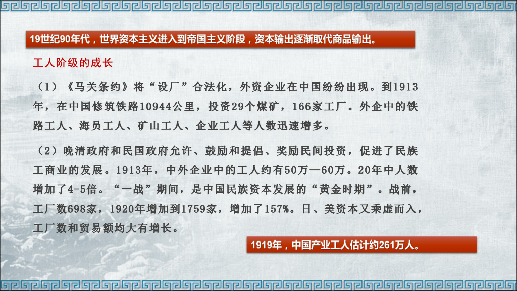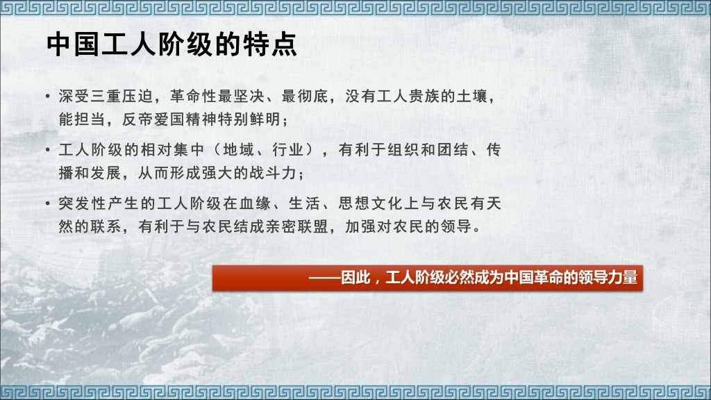 第二,中国工人阶级的成长。简述中国工人阶级的成长历史后,主要介绍中国工人阶级的特点,特别是相对于国际无产阶级,中国工人阶级独有的特点。中国工人阶级的成长,为中国共产党的成立奠定了坚实的阶级基础。
