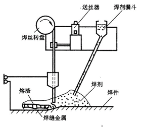 焊接时,颗粒状的焊剂由漏斗沿焊接方向不断在母材拟焊接处铺上焊剂,部分焊剂焊后熔化为焊渣(多余焊剂由吸管吸回再用),焊渣较轻,浮在焊缝金属的表面,使焊缝不与空气接触,同时对焊缝金属补充必要的合金成分,改善焊缝质量。