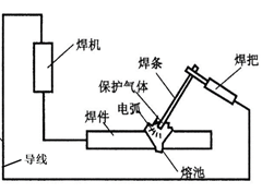 通电后打火,焊条末端与焊件间发生电子放射而产生电弧,高温电弧将焊件钢材局部熔化形成熔池,同时电弧的喷射作用把熔化的焊条金属吹入熔池,冷却后即形成焊缝。