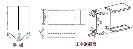 ——焊接工字钢:腹板中央受压,两端受拉;翼缘中央受拉,两端受压